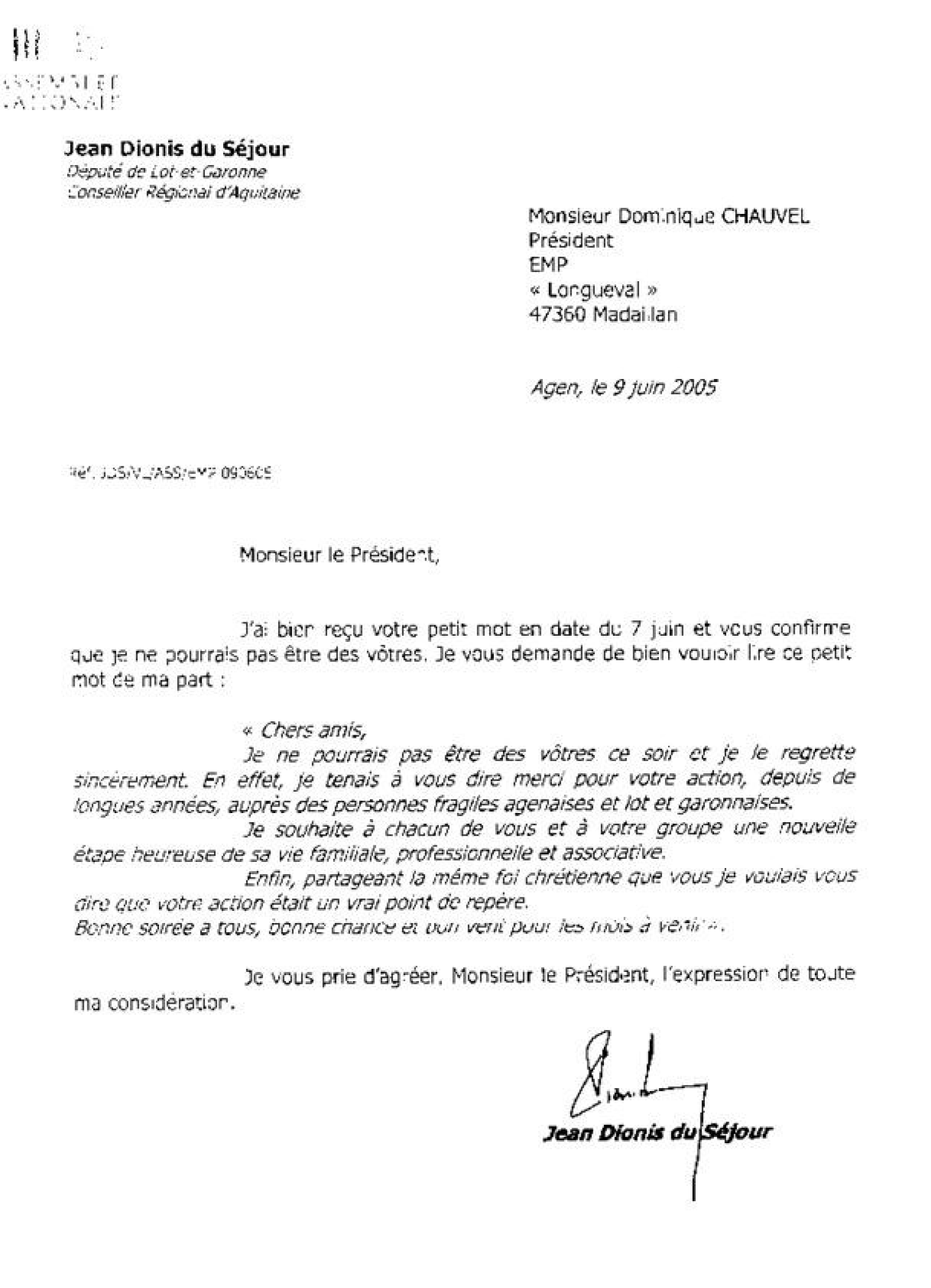 Lettre de remerciement du député-maire