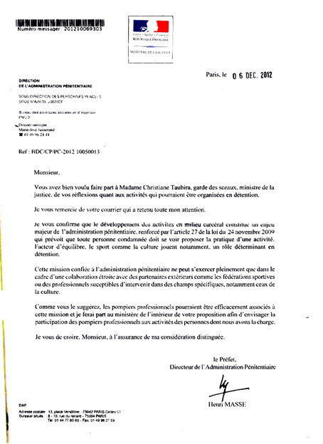 Voici, parmis tant d’autres une réponse à une lettre où il proposait notamment des formations dispensées par des pompiers professionnels à des prisonniers.